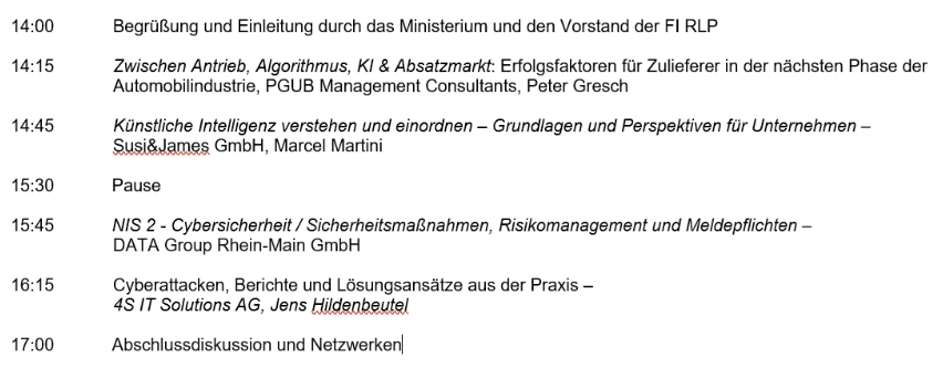 Gemeinsam mit dem Wirtschaftsministerium Rheinland-Pfalz organisiert die Fahrzeug-Initiative Rheinland-Pfalz e.V. eine Veranstaltung zum Thema Digitalisierung und Einsatz von KI im Unternehmen. Wir haben Experten zu Gast, die über Digitalisierungs- und KI Projekte in mittelständischen Betrieben berichten. Zudem werden wir über den rechtlichen Rahmen und die Risiken des Einsatzes von KI informieren und bekommen praxisbewährte Lösungsansätze.