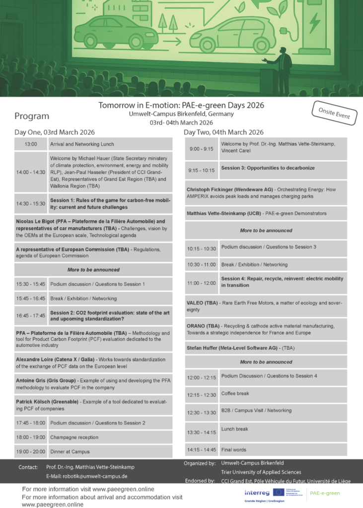 Am 3. und 4. März finden die PAE-e-green Days 2026 am Umweltcampus Birkenfeld statt, zu welchen wir als strategischer Projektpartner unsere Mitglieder und Netzwerkpartner herzlich einladen. Programm und Kontaktadressen finden Sie nachstehend.